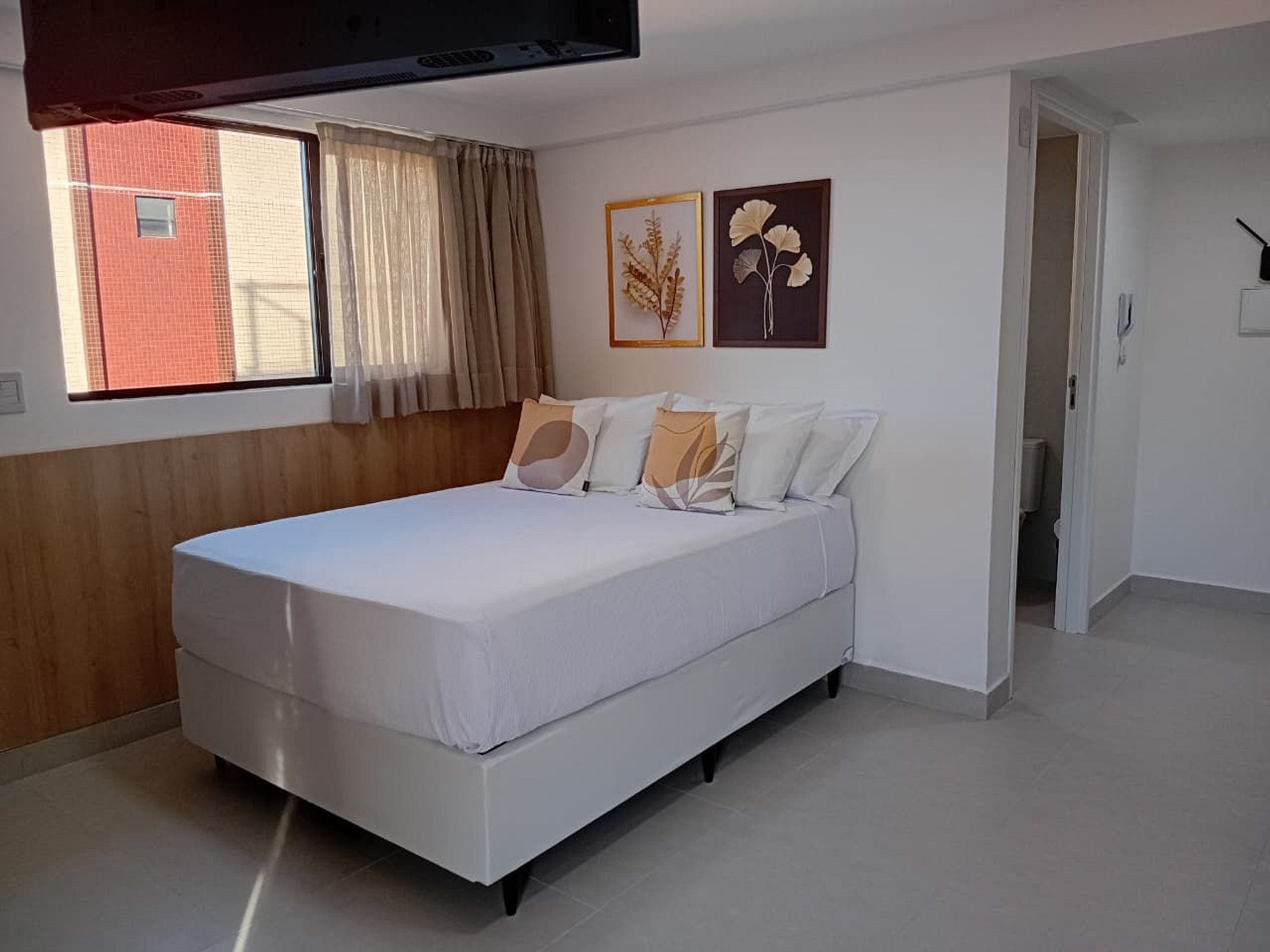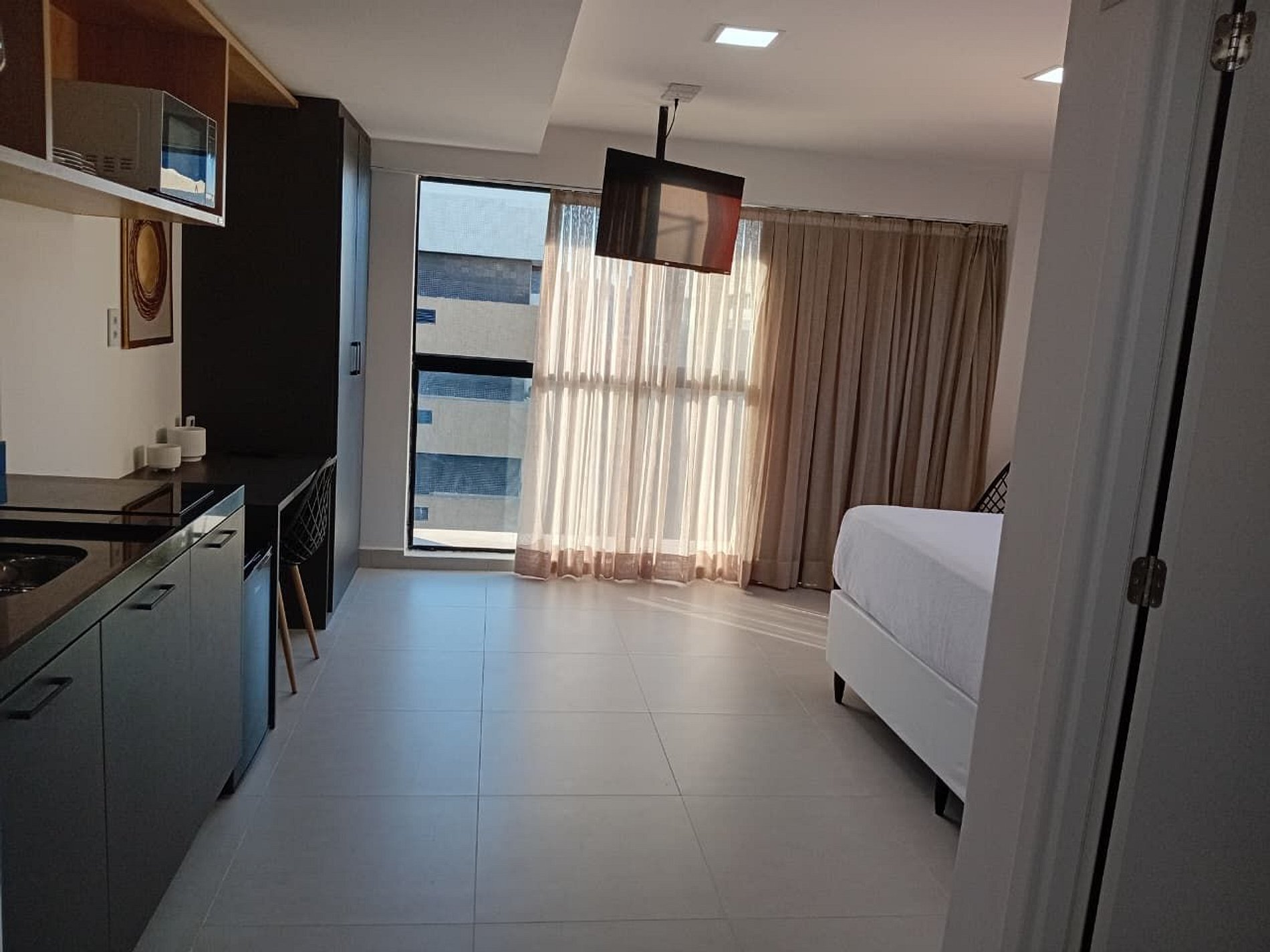 O estudio dispoe de cozinha compacta com cooktop, microondas, liquidificador, cafeteira, geladeira, sanduicheira, copos talheres, toalhas, roupas de cama tudo para voce ter sua estadia bem confortavel e tranquila, em um ambiente aconchegante, limpo higienizado