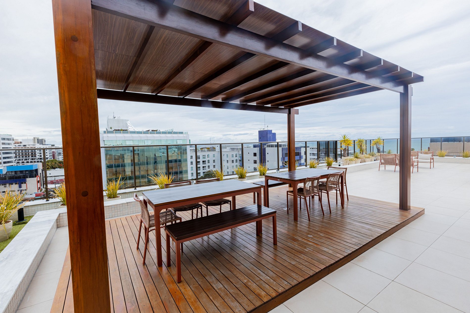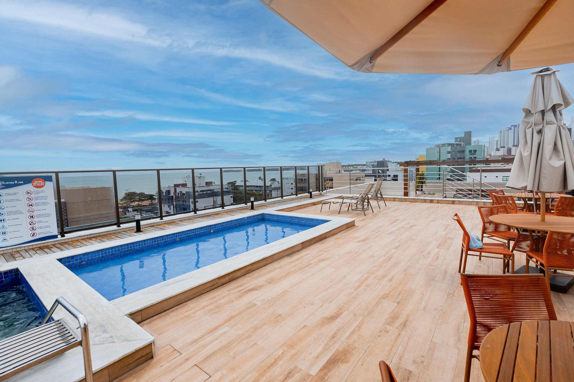 O prédio dispõe de recepção 24h, estacionamento privativo gratuito, e wifi. Na área de lazer que fica no último pavimento, constam os itens de piscina, salão de festas, espaço gourmet, espaço fitness e lounge.