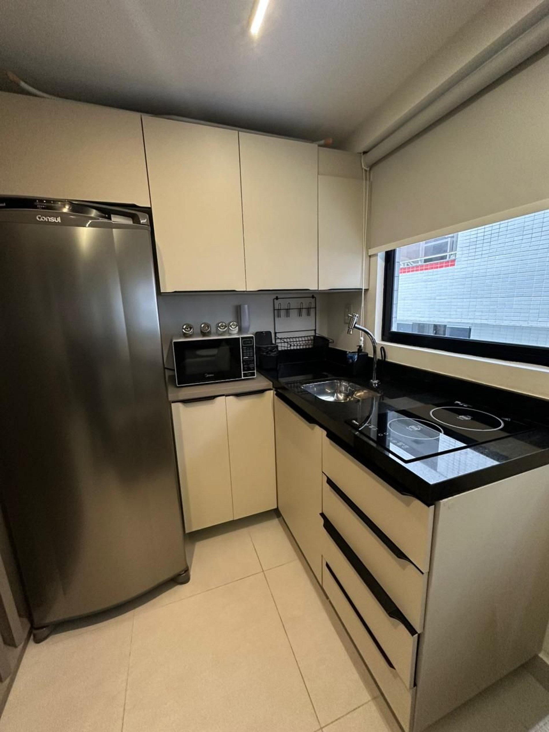 O estudio dispoe de cozinha compacta com cooktop, microondas, liquidificador, cafeteira, geladeira, sanduicheira, copos talheres, toalhas, roupas de cama tudo para voce ter sua estadia bem confortavel e tranquila, em um ambiente aconchegante, limpo higienizado