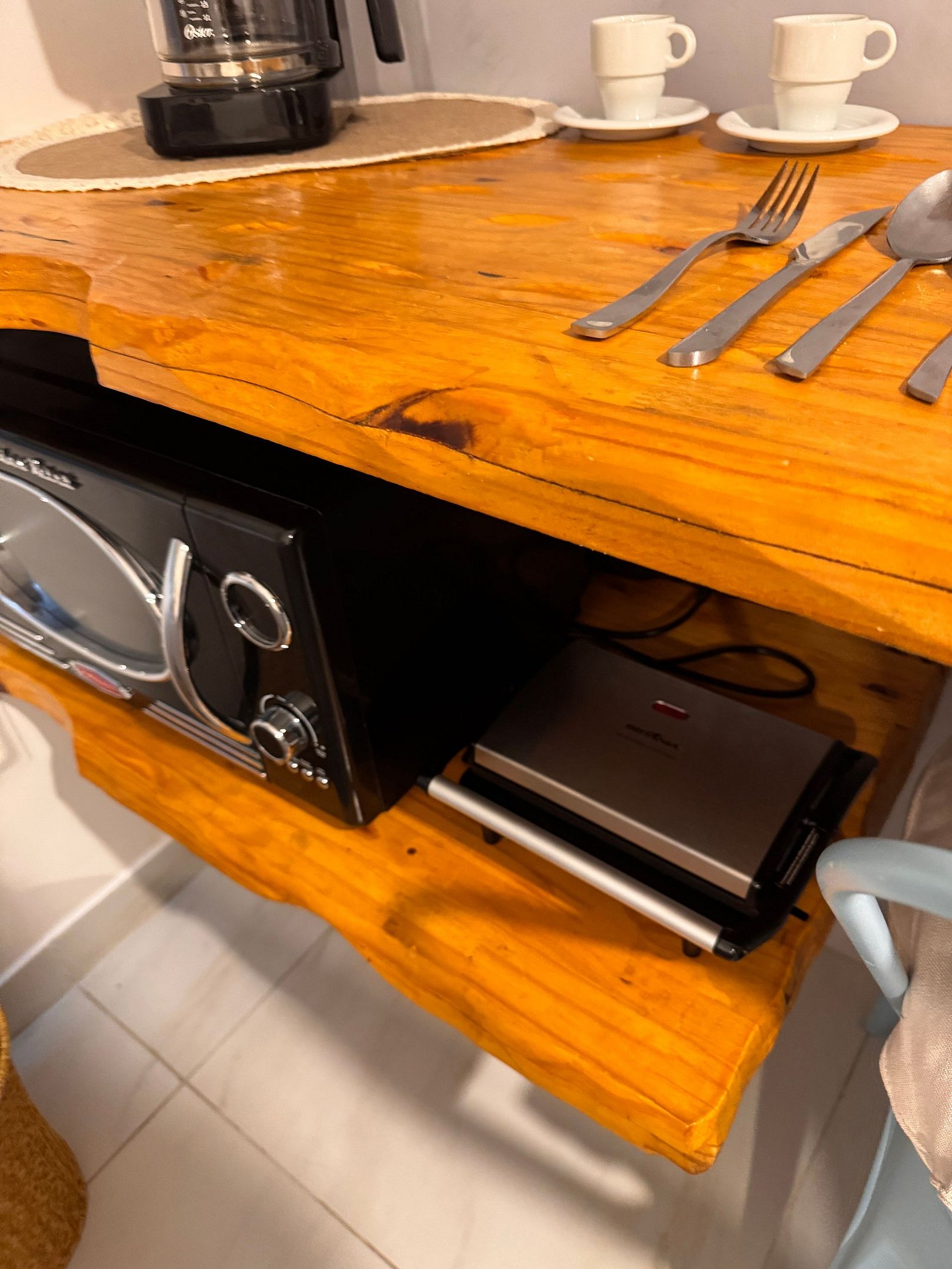 O espaço dispõe de cama confortável, banheiro privativo, ar-condicionado, Smart TV e Wi-Fi de alta velocidade. A cozinha compacta é equipada com pratos, talheres, copos, xícaras, cafeteira, micro-ondas e sanduicheira, proporcionando tudo o que você precisa para uma estadia prática e agradável.