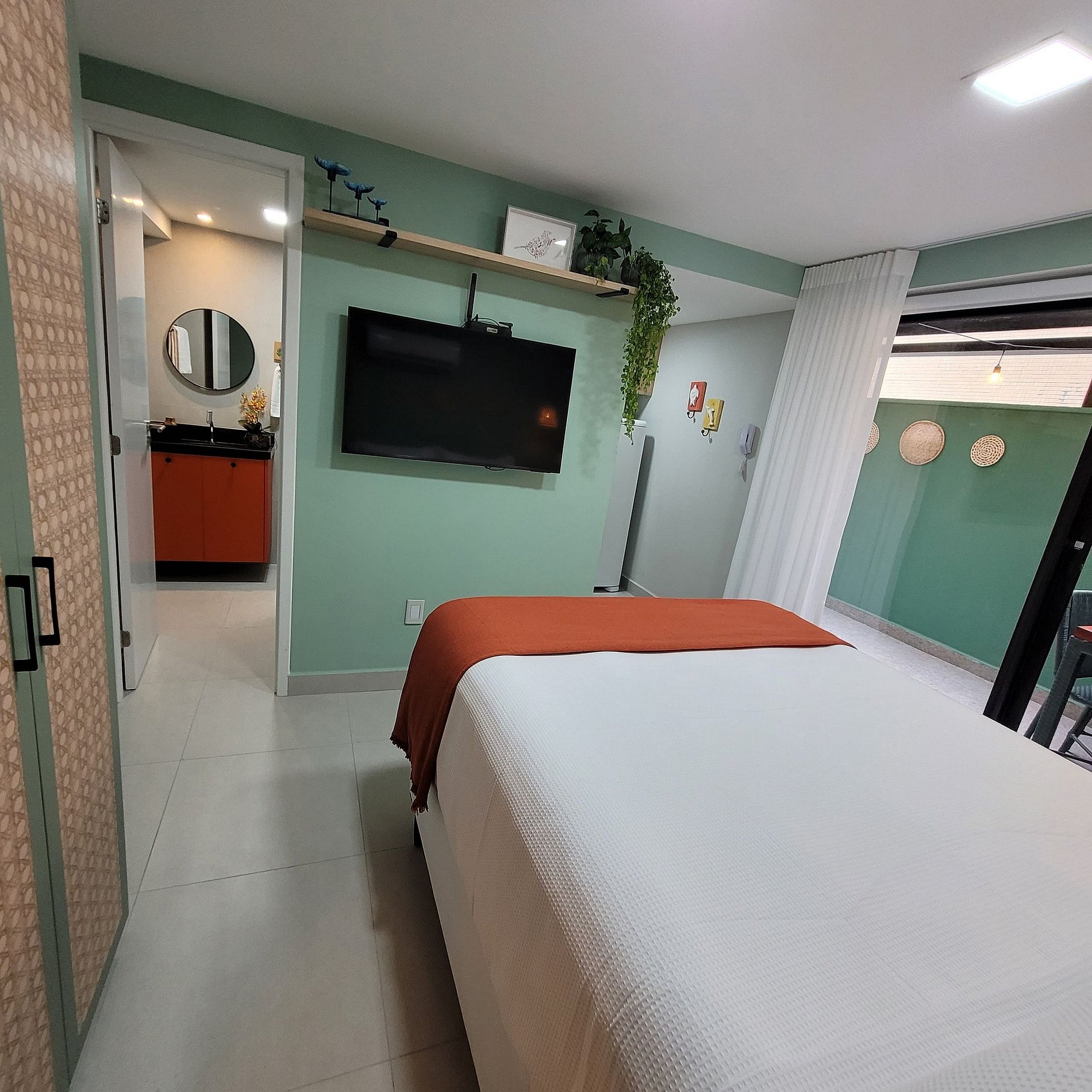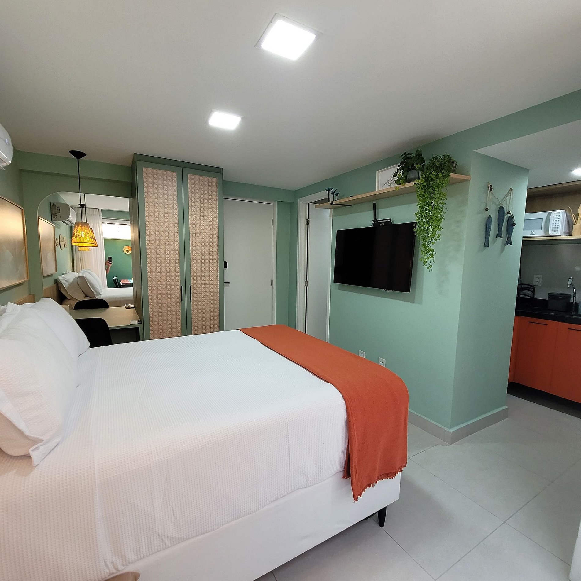 Funcionalidade: O espaço é inteligentemente otimizado, combinando área de estar, dormitório (com cama Queen Size ou de alto padrão) e cozinha kitchenette completa, tudo integrado com fluidez e bom gosto.