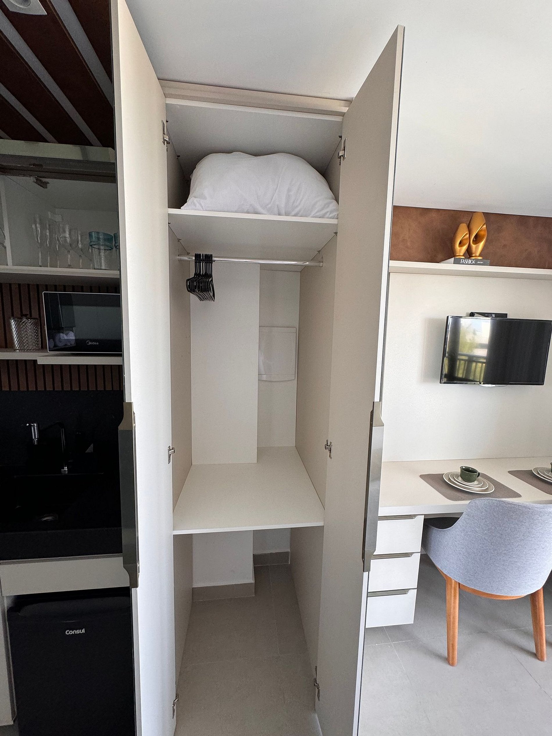 O apartamento é equipado de forma a trazer maior comodidade e conforto para nossos clientes. Trabalhamos com as melhores marcas do mercado, portanto, oferecemos sempre roupa de cama, mesa e banho limpas e passadas.