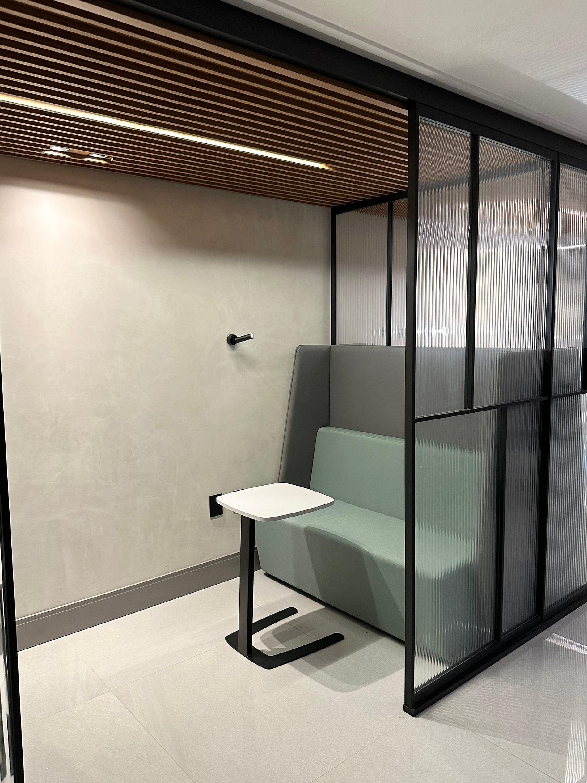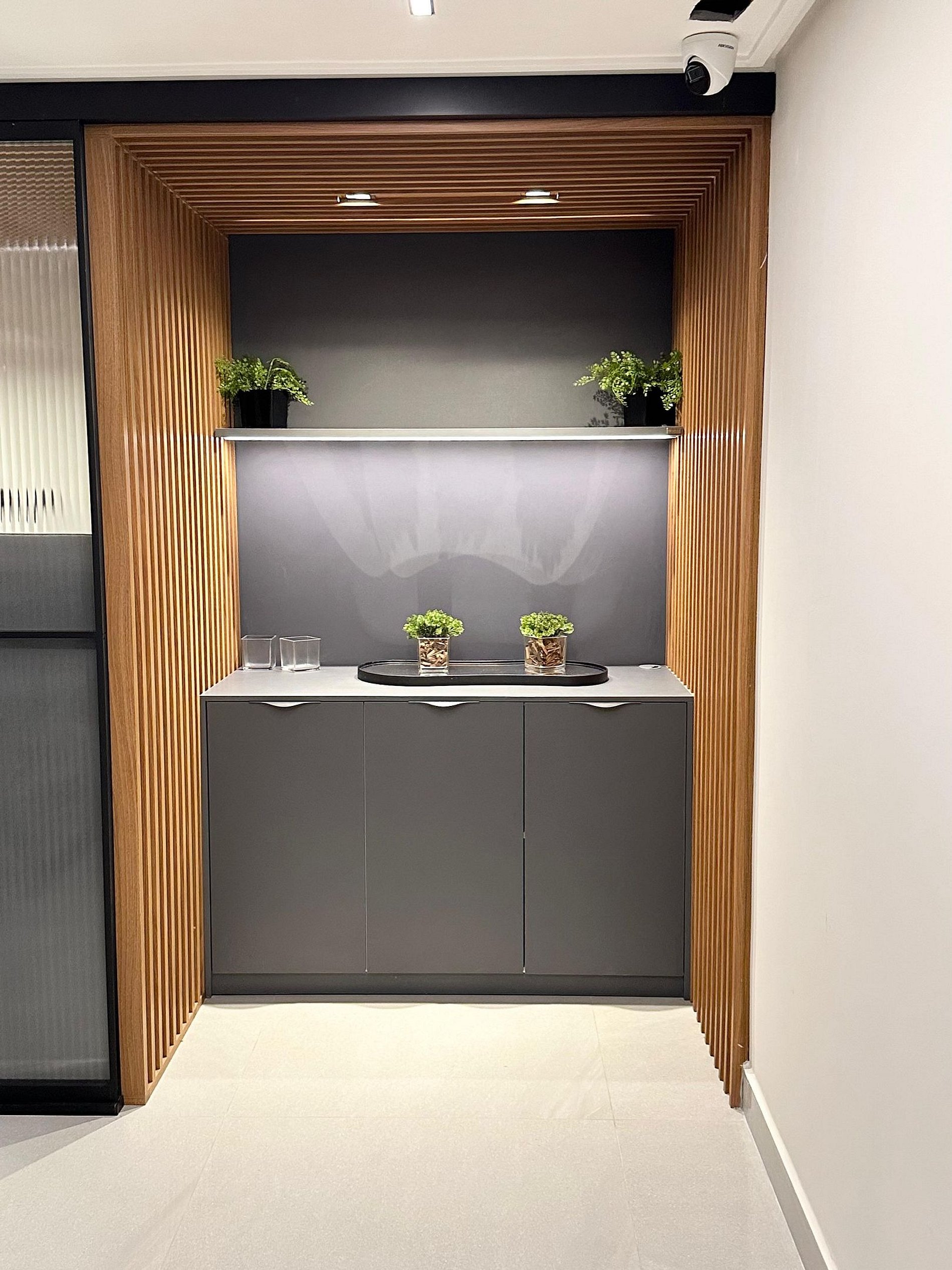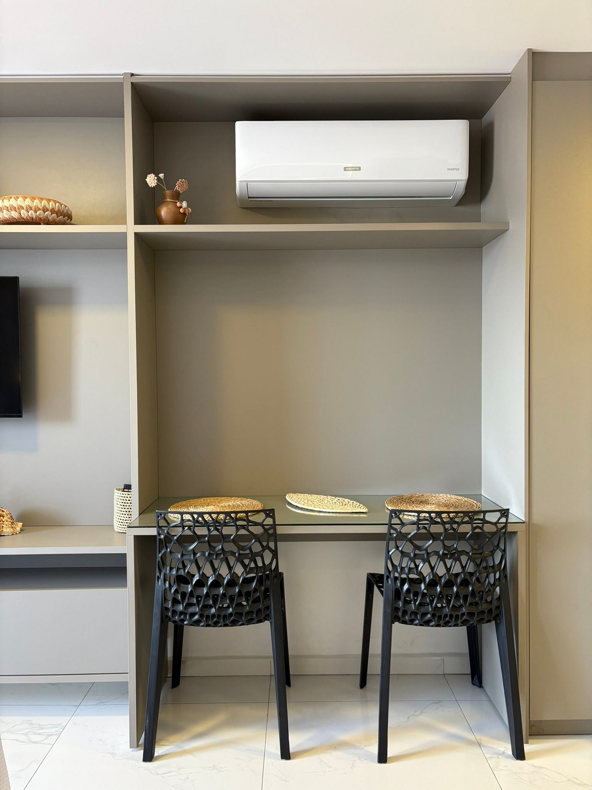 Design e Decoração: O estúdio foi decorado com um projeto contemporâneo, otimizando o espaço e garantindo um ambiente acolhedor.