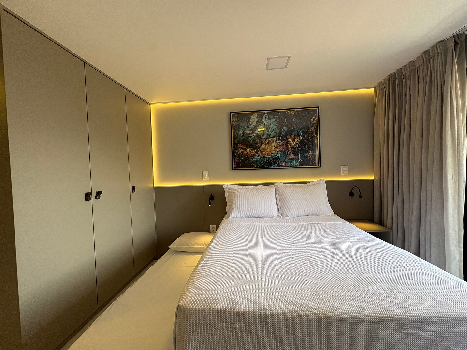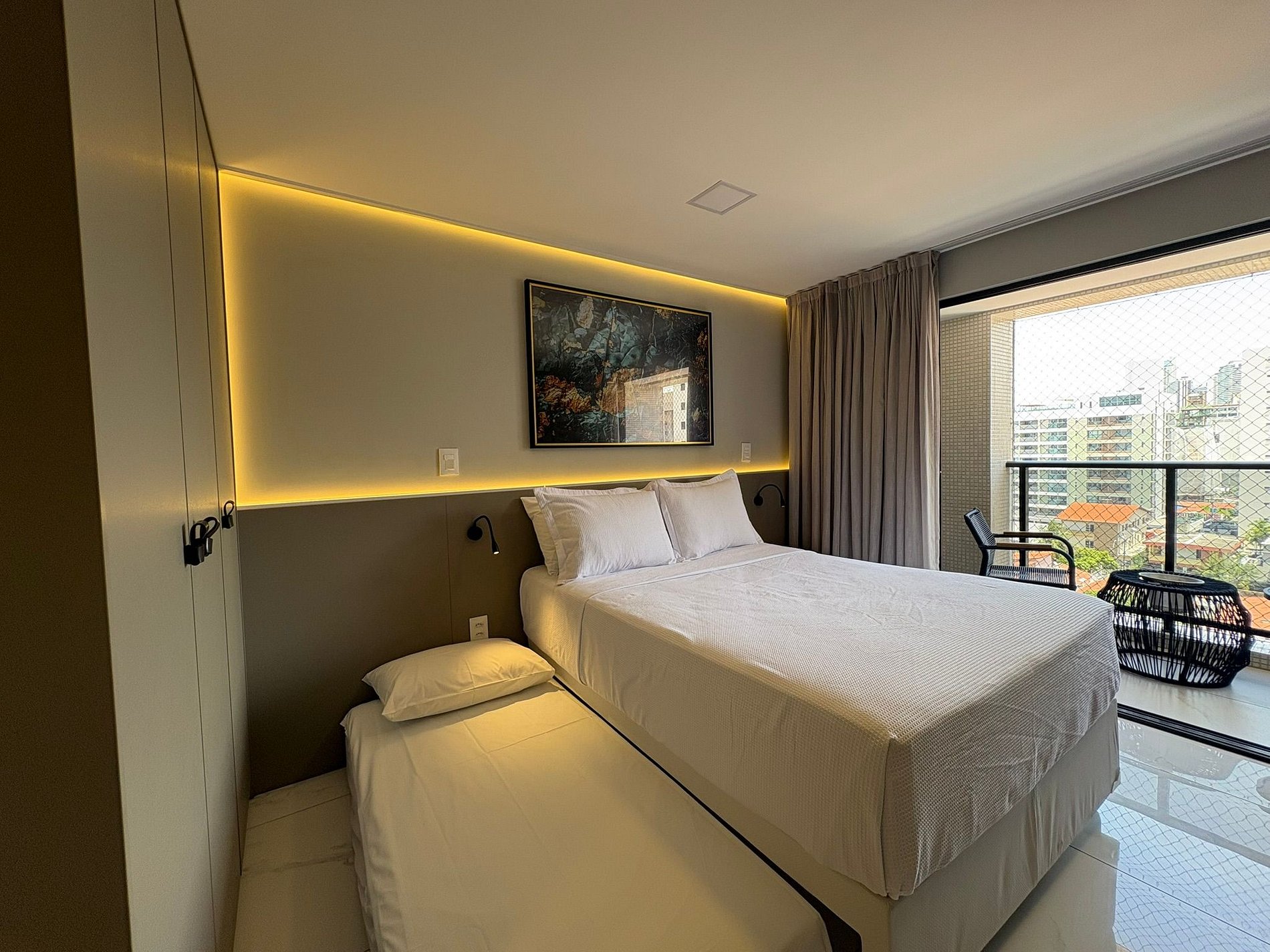 Este flat de 28m² foi cuidadosamente planejado para oferecer conforto, funcionalidade e uma estadia agradável. O ambiente é climatizado e bem distribuído, com uma confortável cama queen e uma cama de solteiro, ideal para até 3 hóspedes.