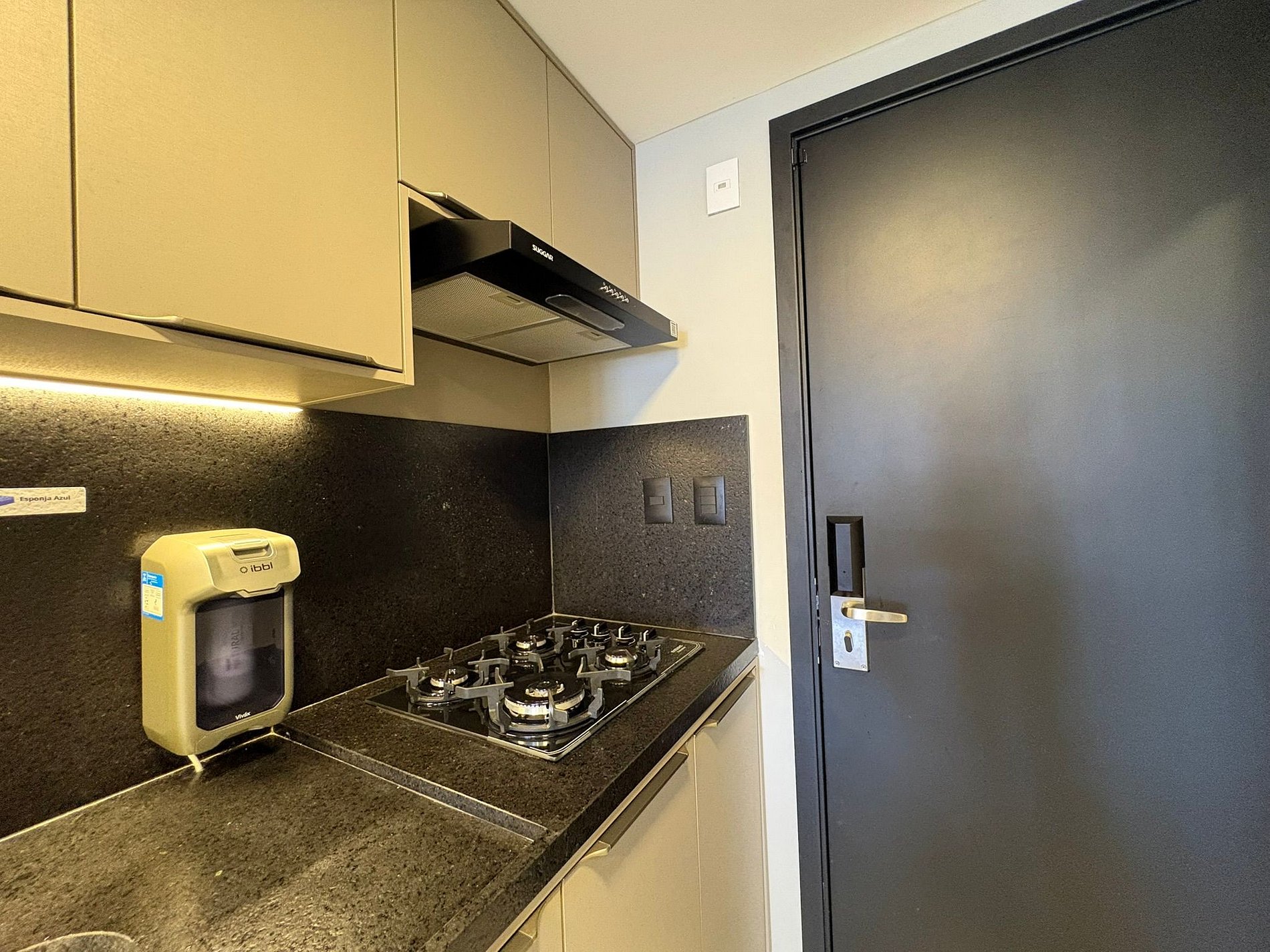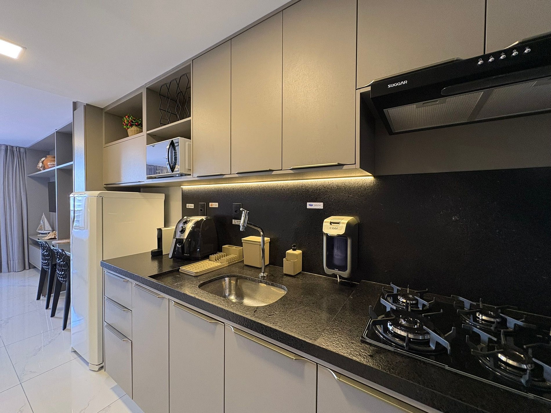 Cozinha Compacta e Funcional: A mini-cozinha (ou kitchenette) é completa para as suas necessidades de temporada. Inclui frigobar ou geladeira compacta, micro-ondas, cooktop elétrico, e os utensílios básicos para o preparo de refeições rápidas.