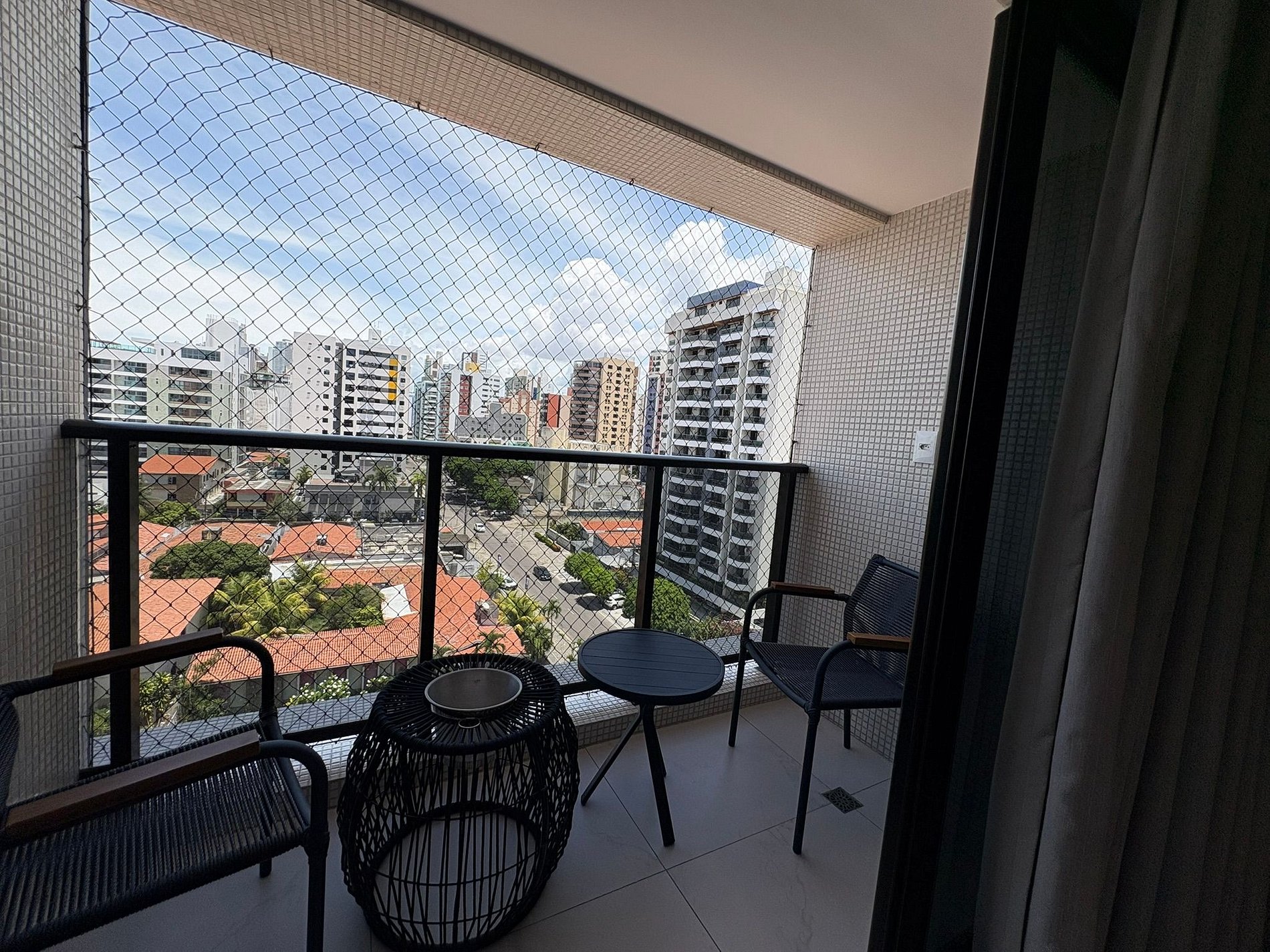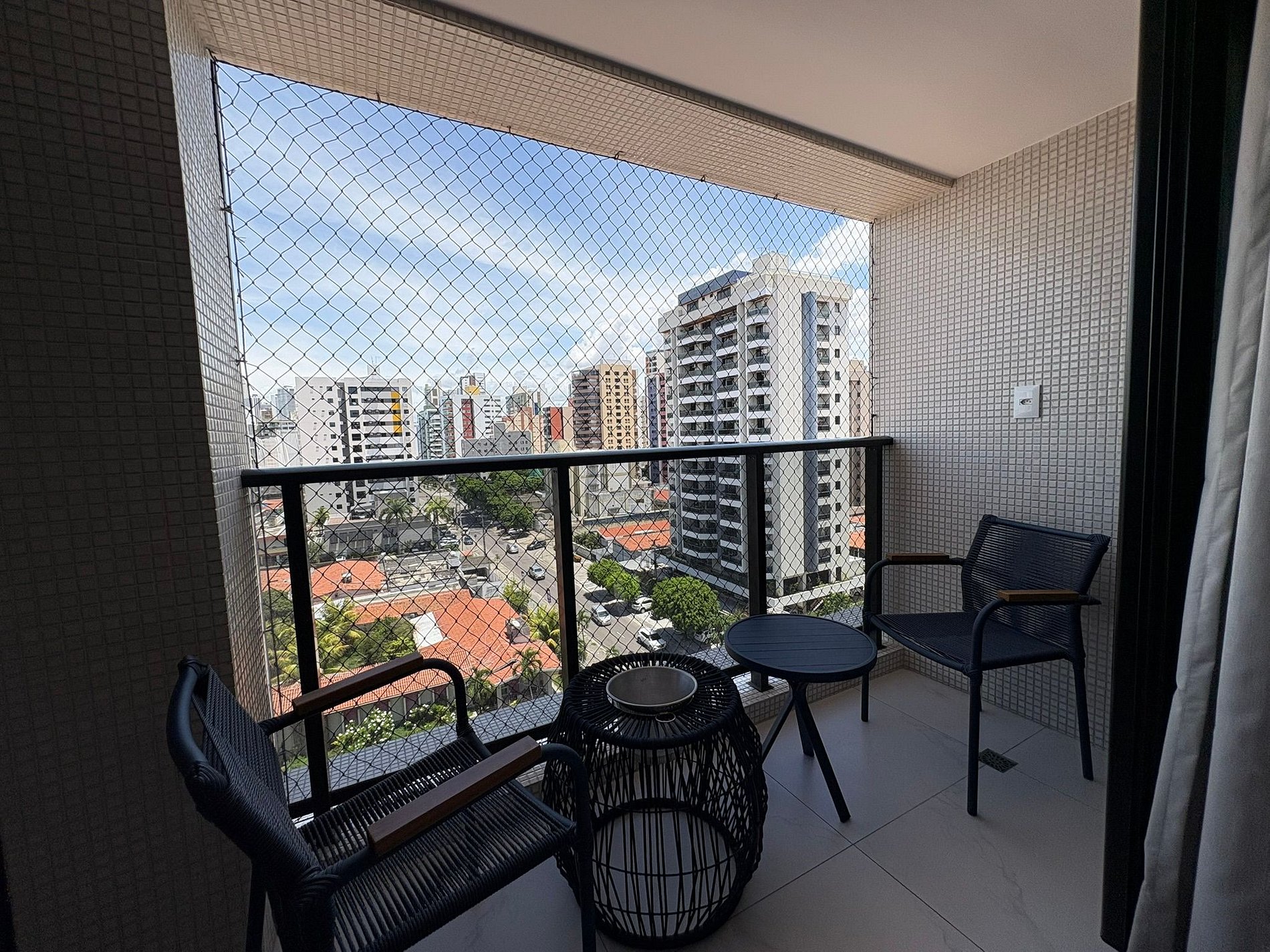 A varanda privativa, com cadeiras, é um convite para relaxar e aproveitar momentos tranquilos.