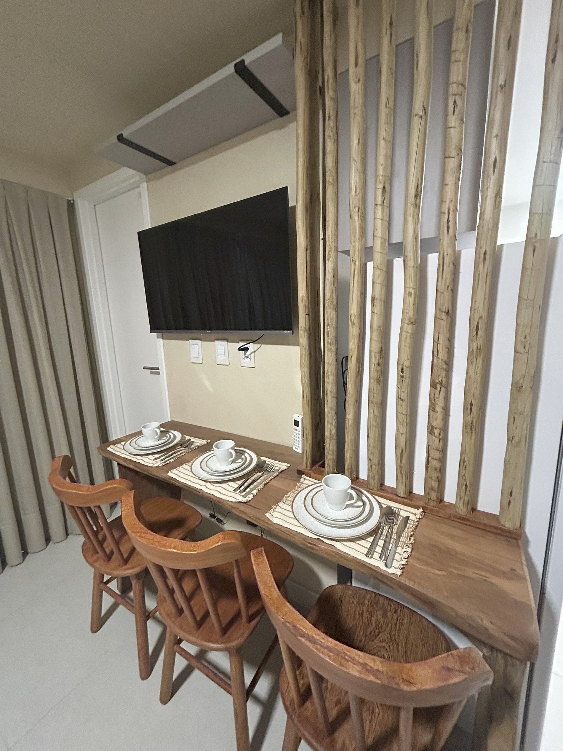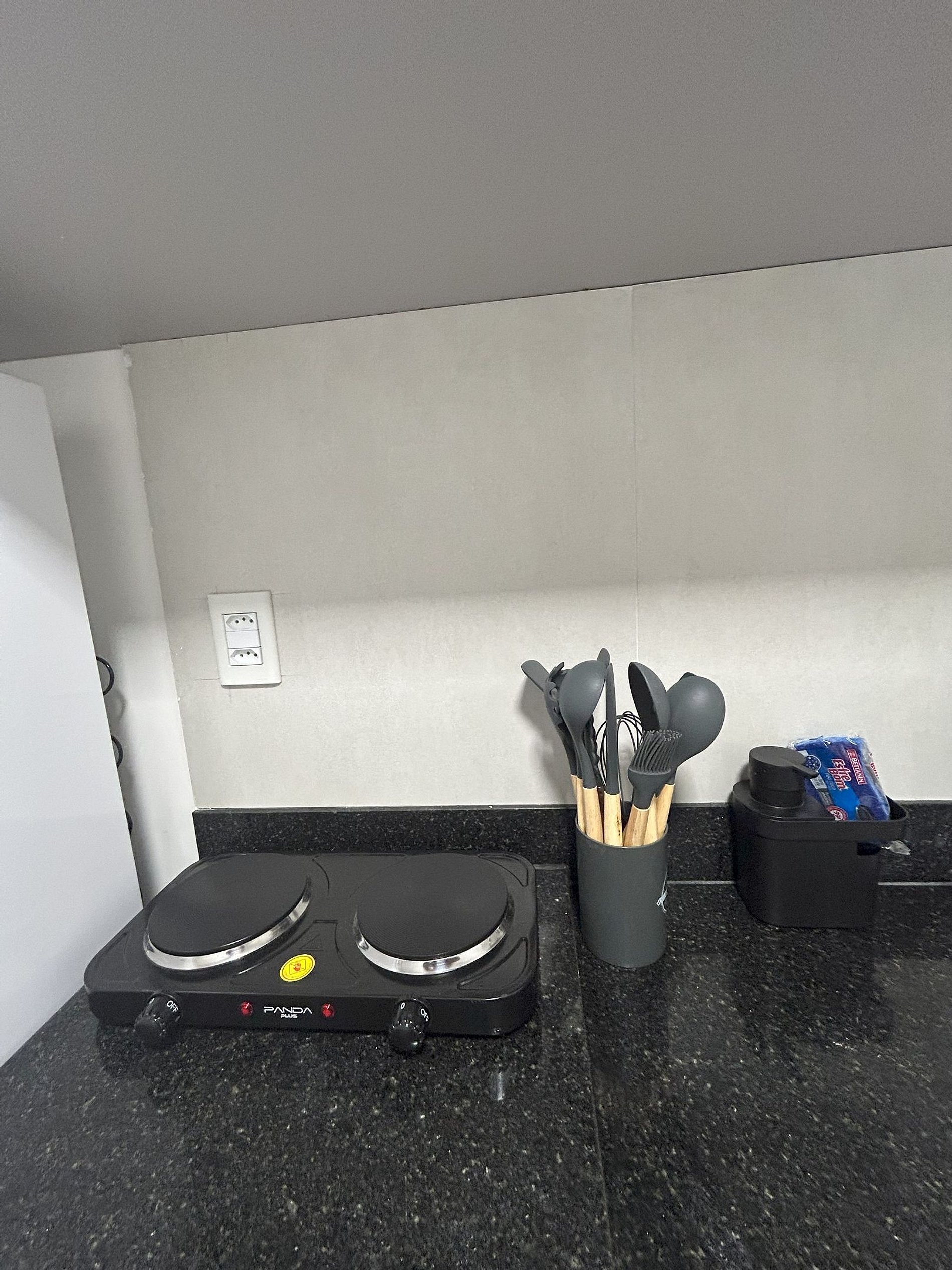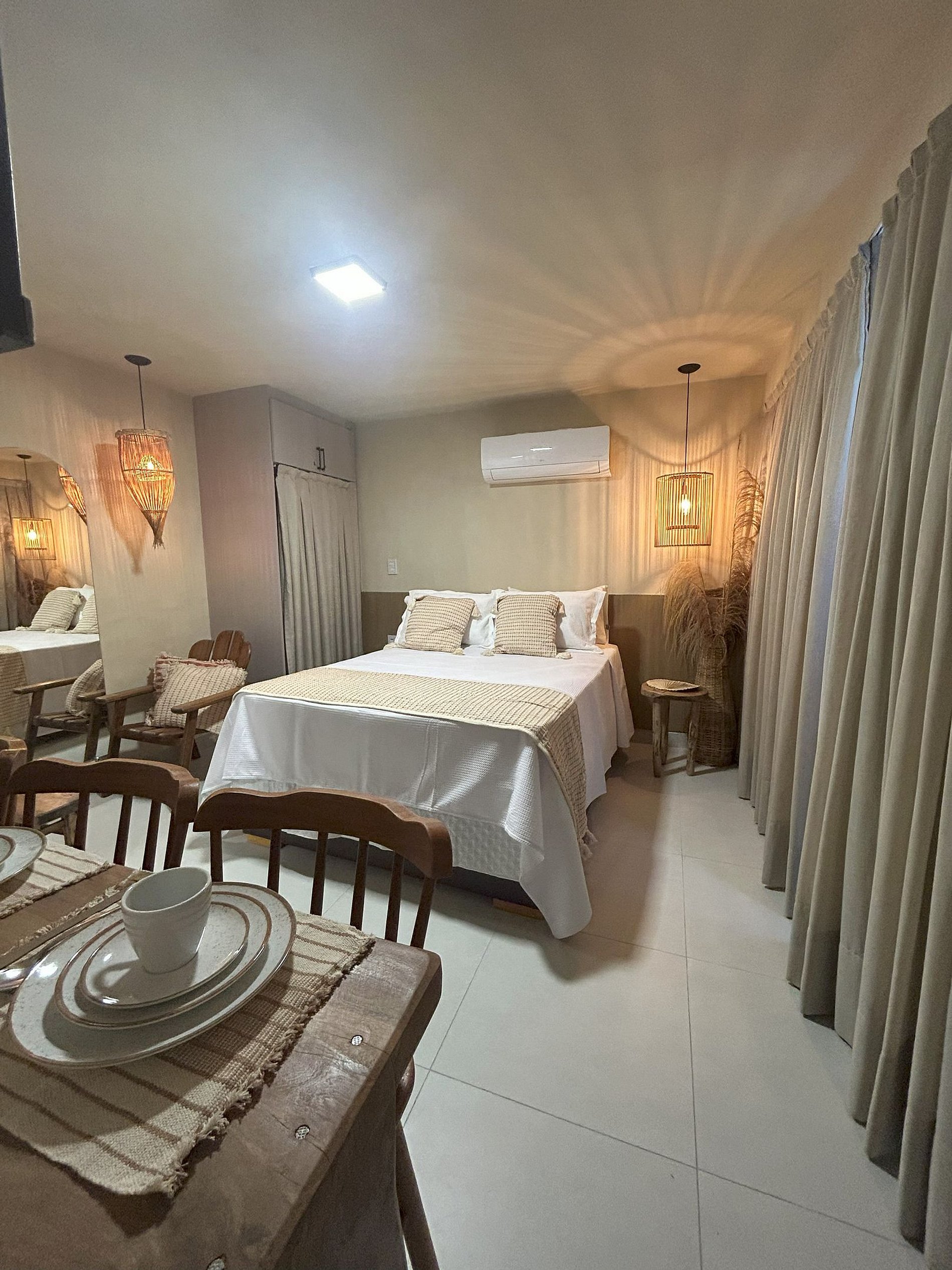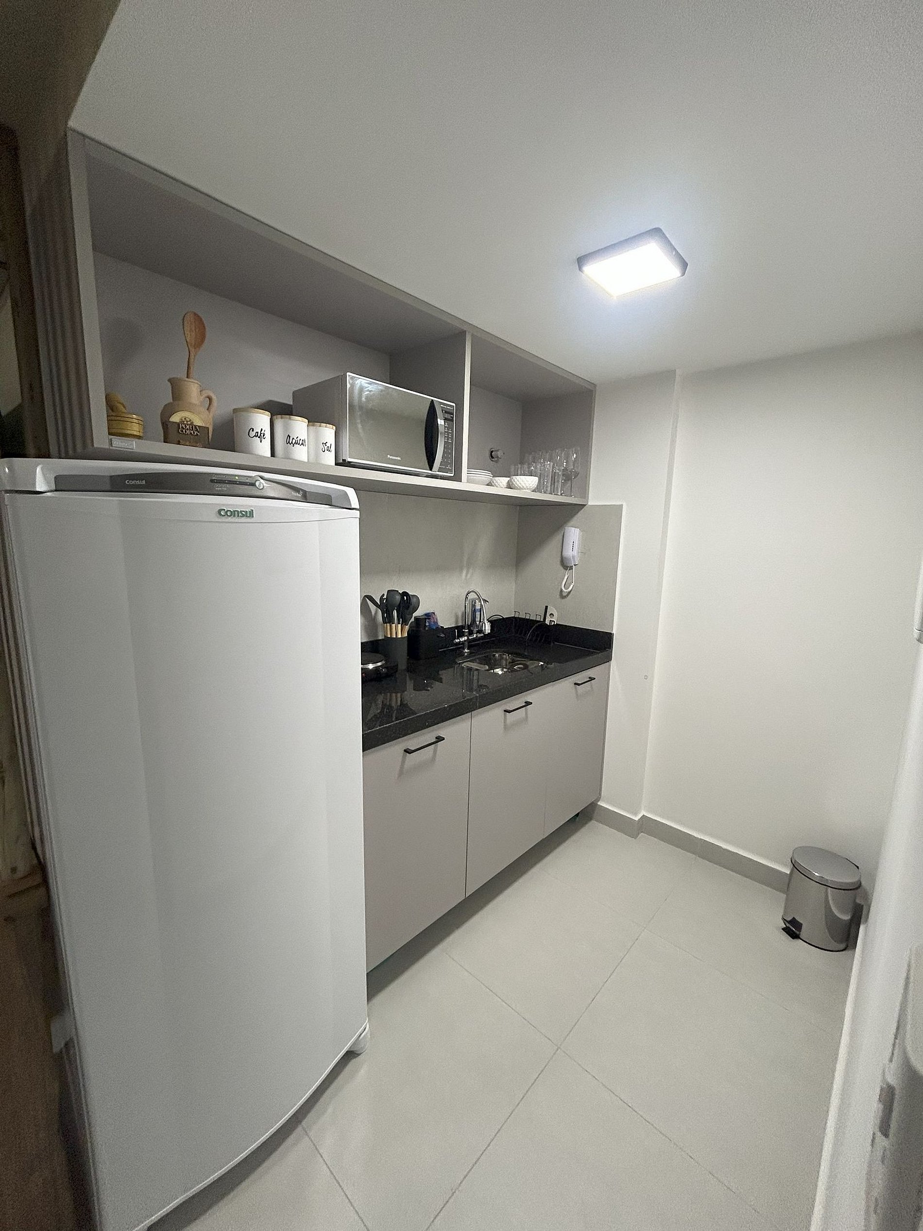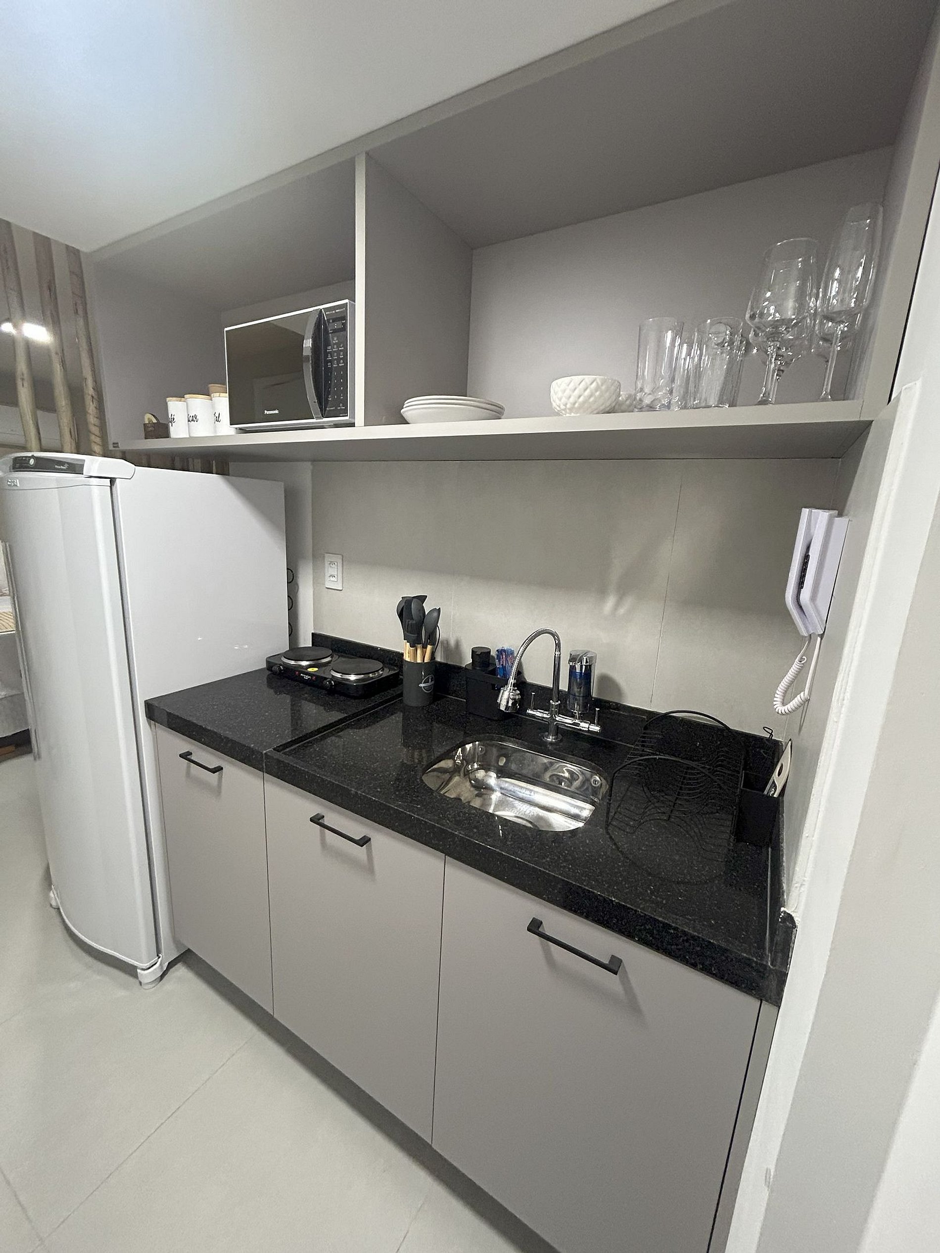 O Estudio decorado e ambientado, dispoe de cama de casal, televisao smart, internet wifi, cozinha compacta com panelas, cooktop microondas, geladeira, e utensilios