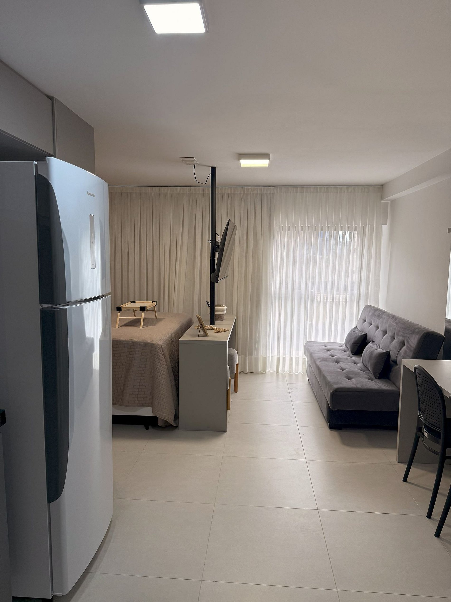 O estudio dispoe de cozinha compacta com cooktop, microondas, liquidificador, cafeteira, geladeira, sanduicheira, copos talheres, toalhas, roupas de cama tudo para voce ter sua estadia bem confortavel e tranquila, em um ambiente aconchegante, limpo higienizado