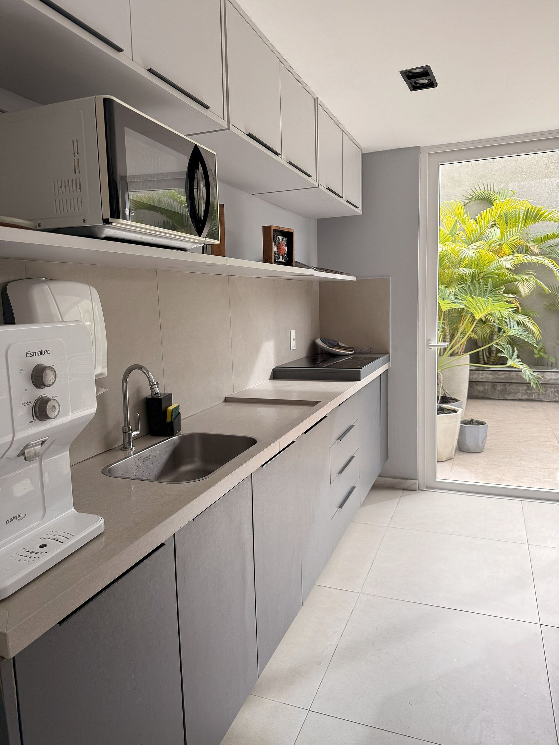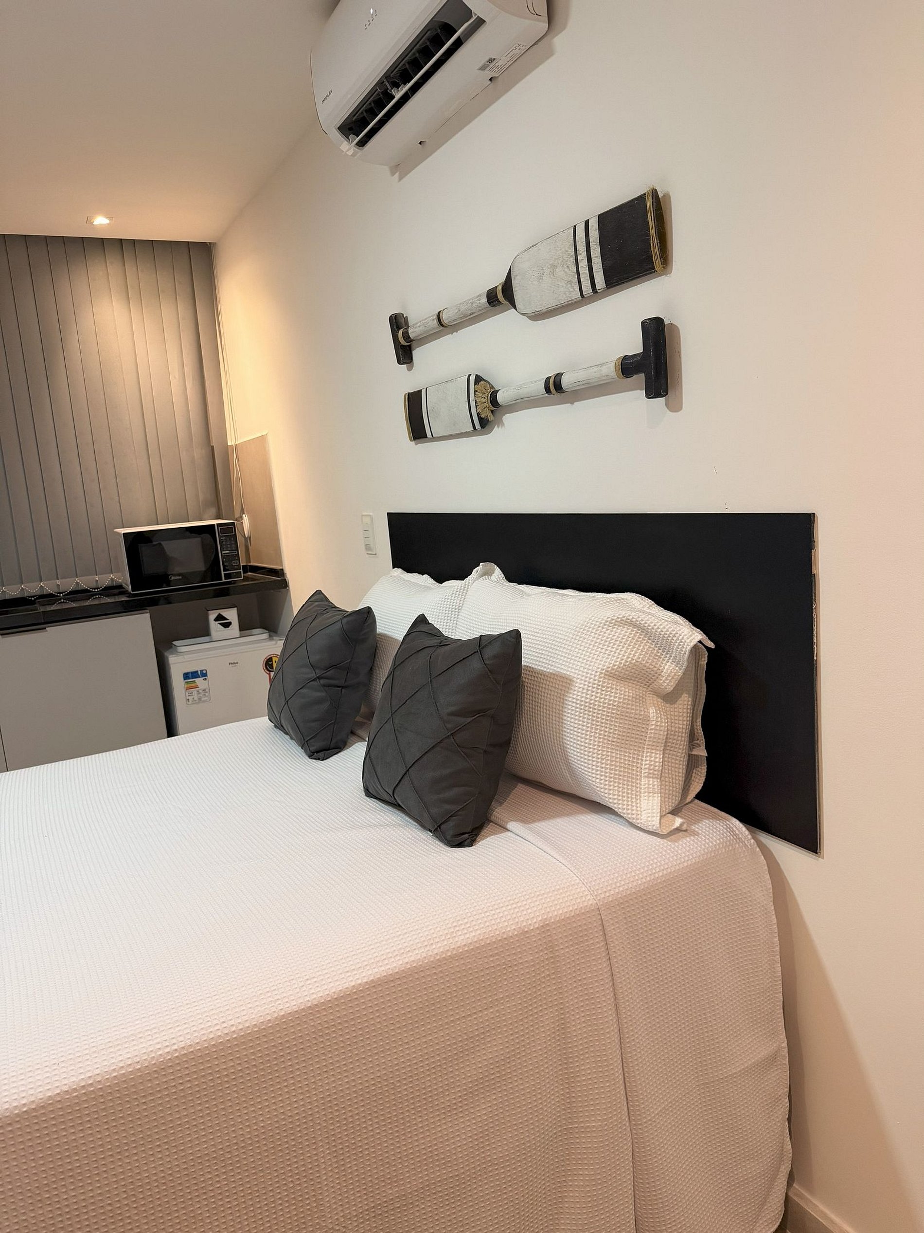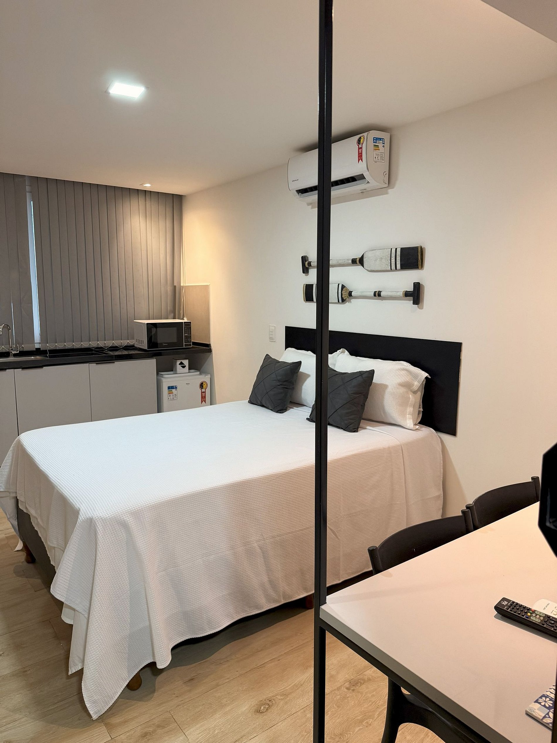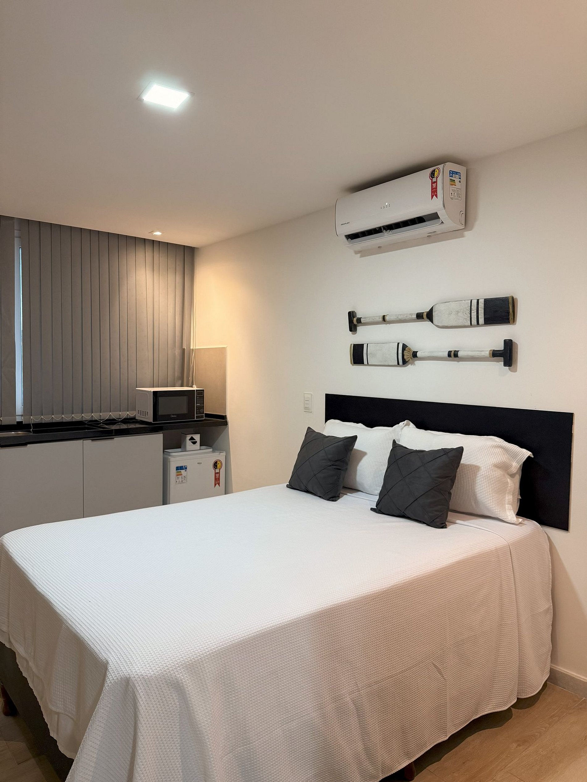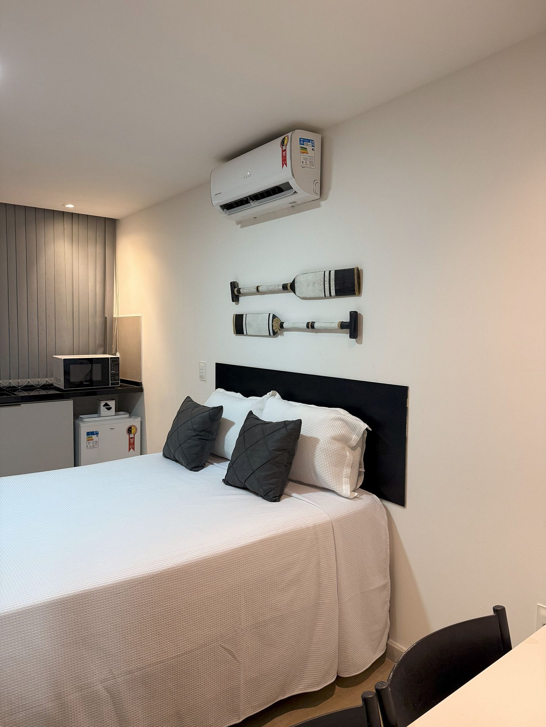 O estudio conta de uma cozinha compacta, com microondas, frigobar, cafeteira, ar condicionado, utensilios de cozinha, talheres, roupa de cama e toalhas