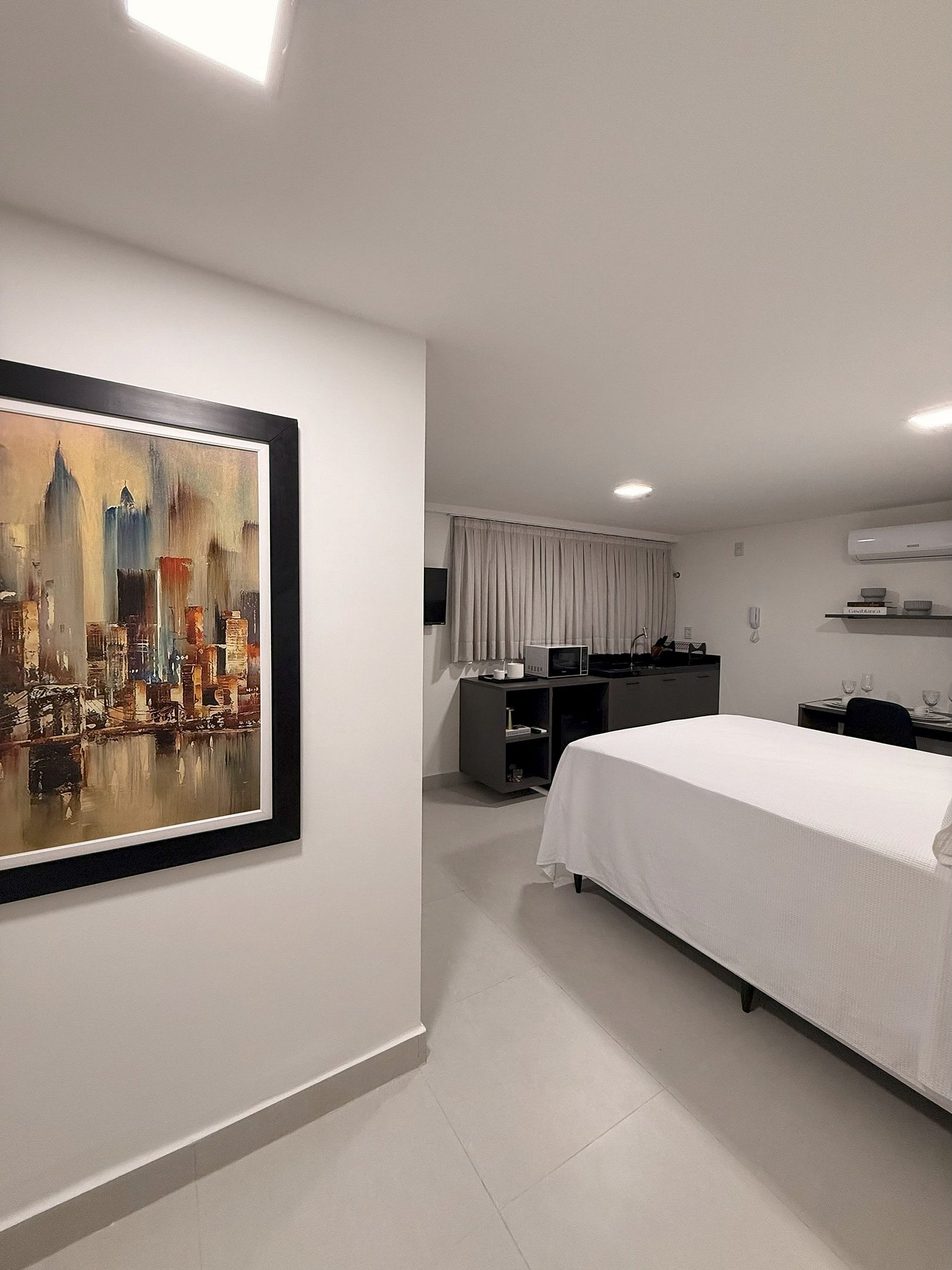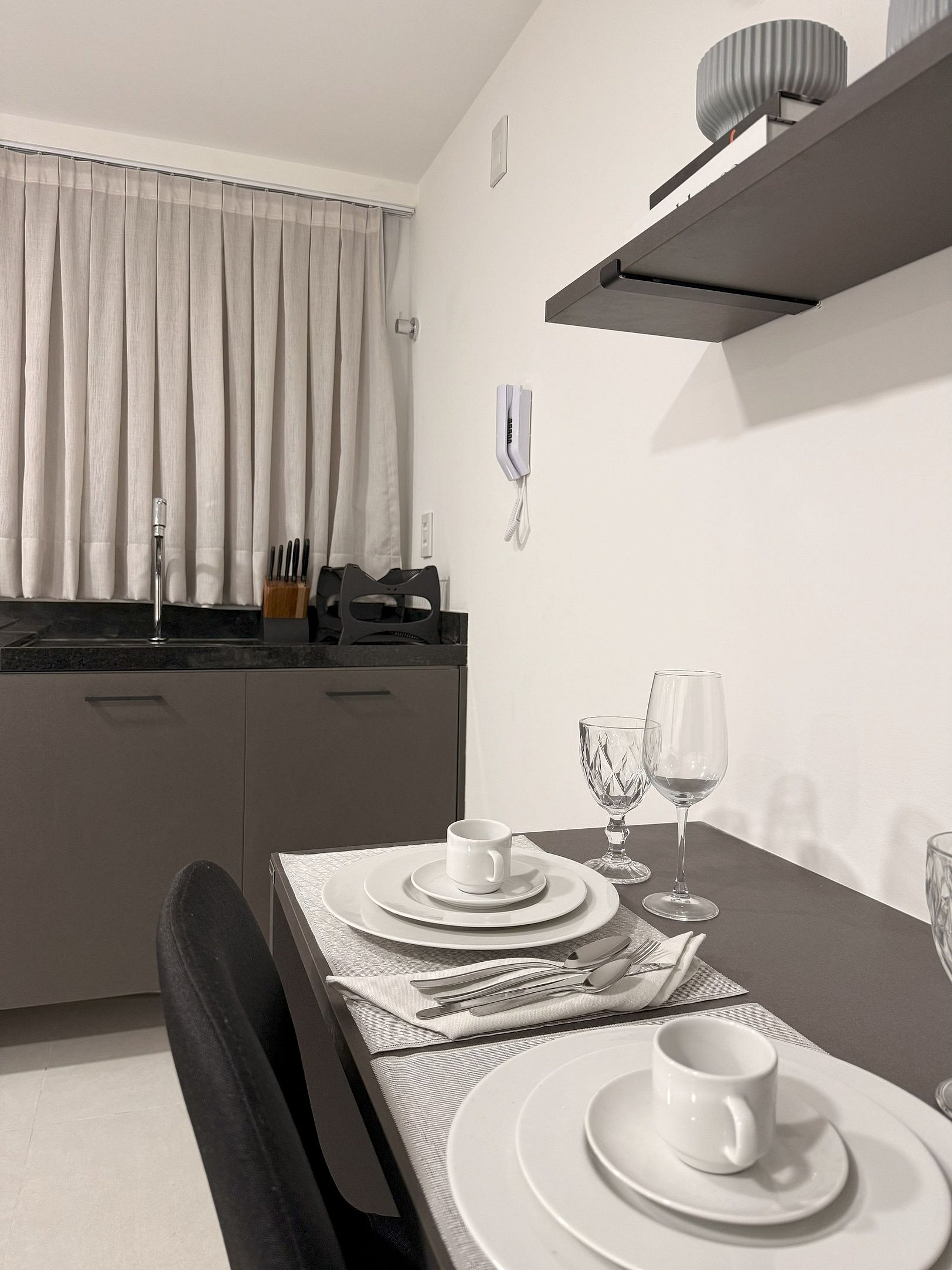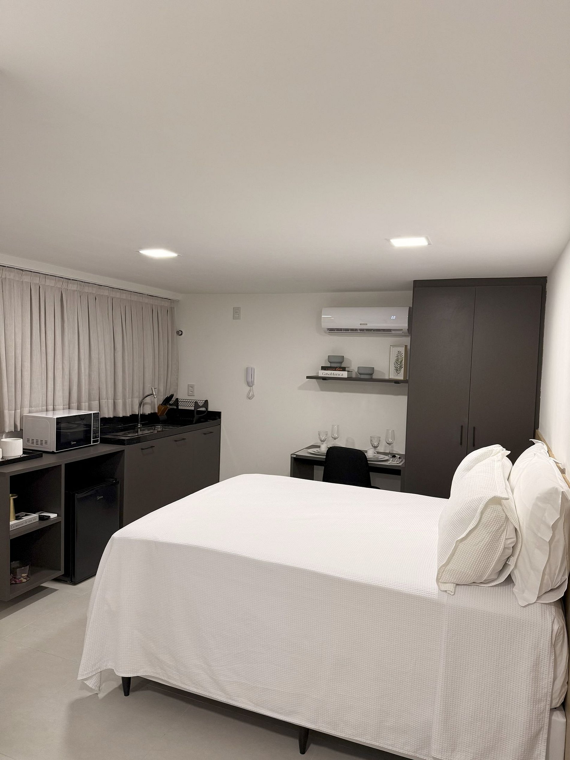 O estudio dispoe de cozinha compacta com cooktop, microondas, liquidificador, cafeteira, geladeira, sanduicheira, copos talheres, toalhas, roupas de cama tudo para voce ter sua estadia bem confortavel e tranquila, em um ambiente aconchegante, limpo higienizado