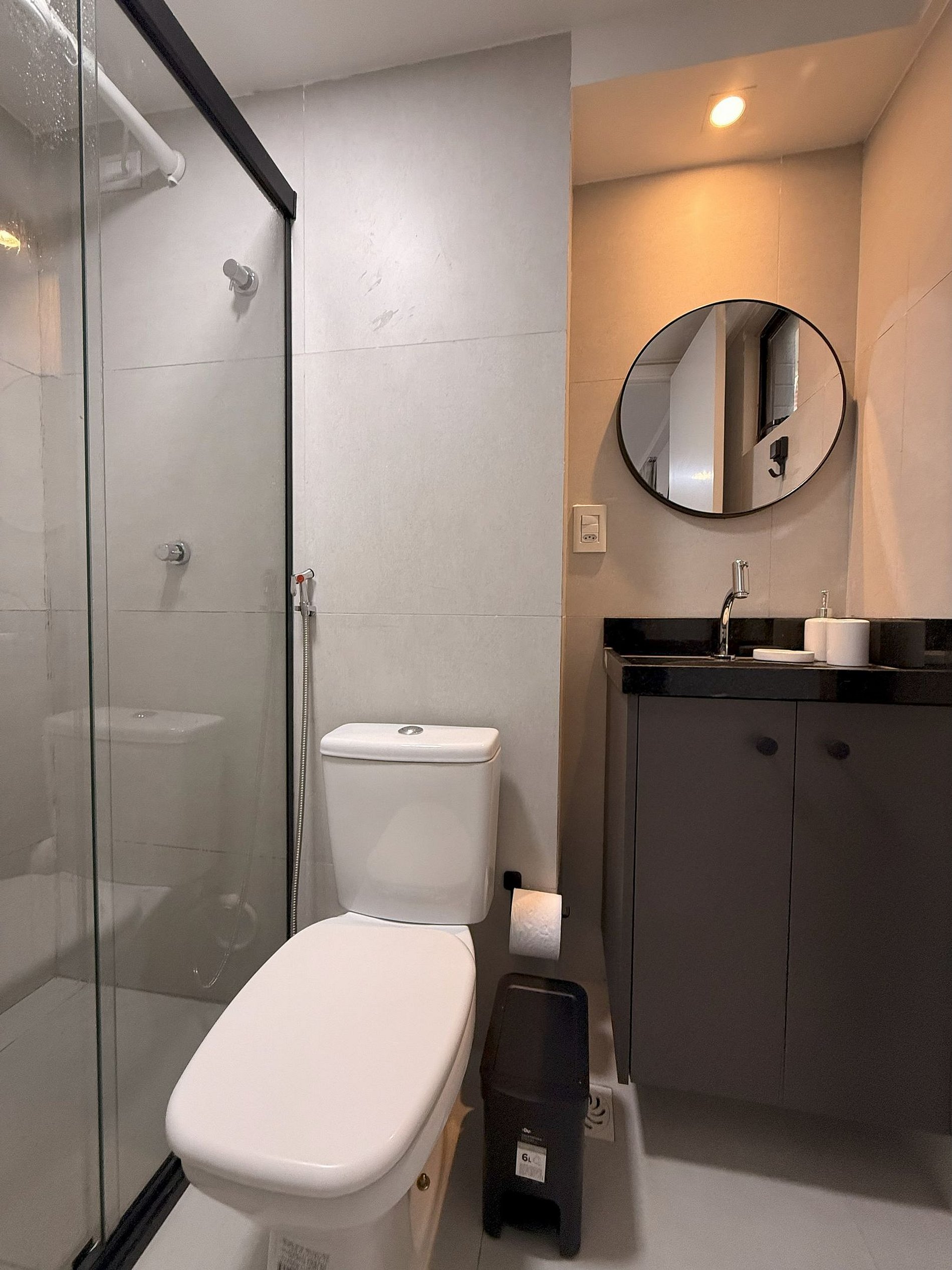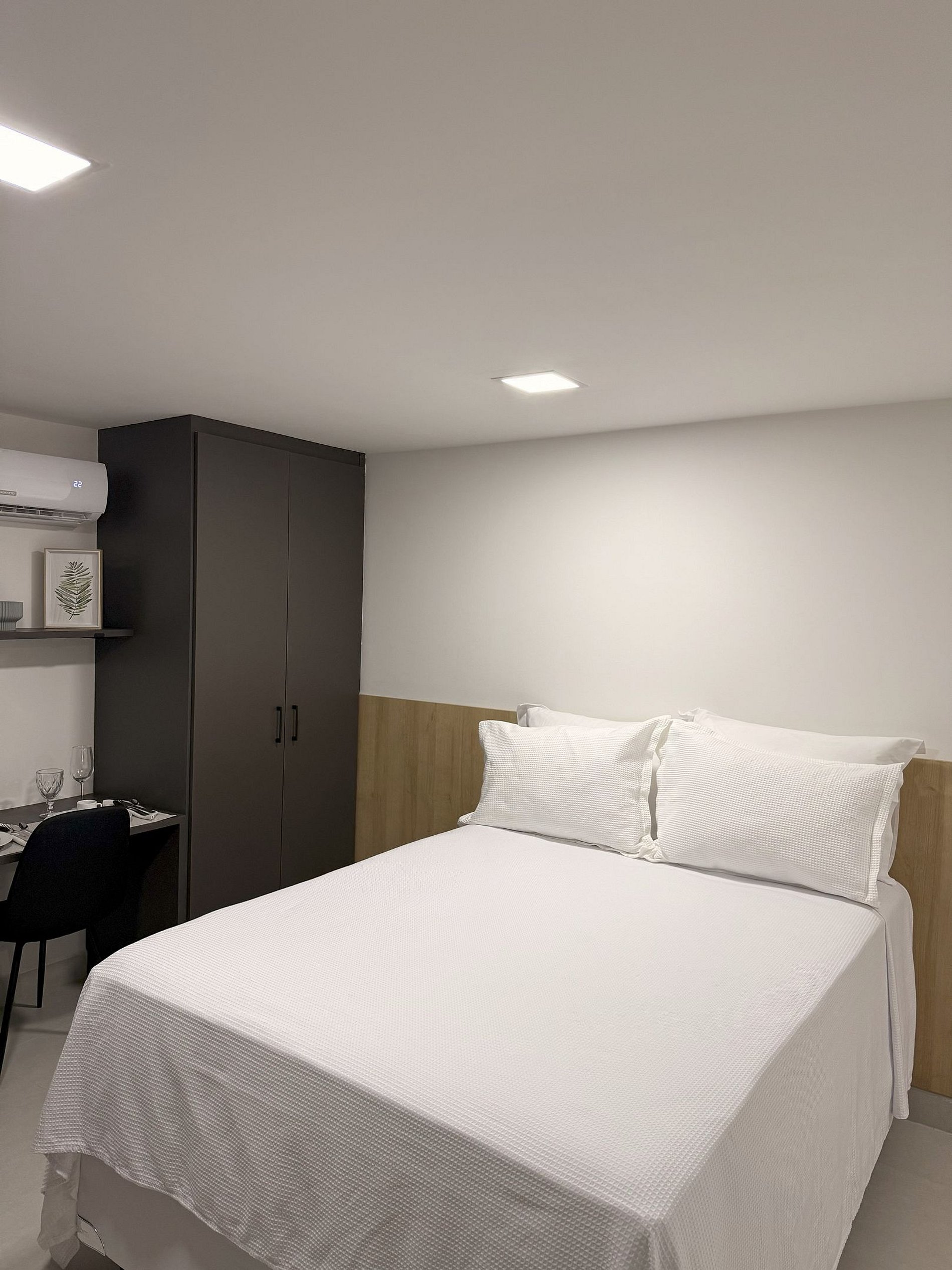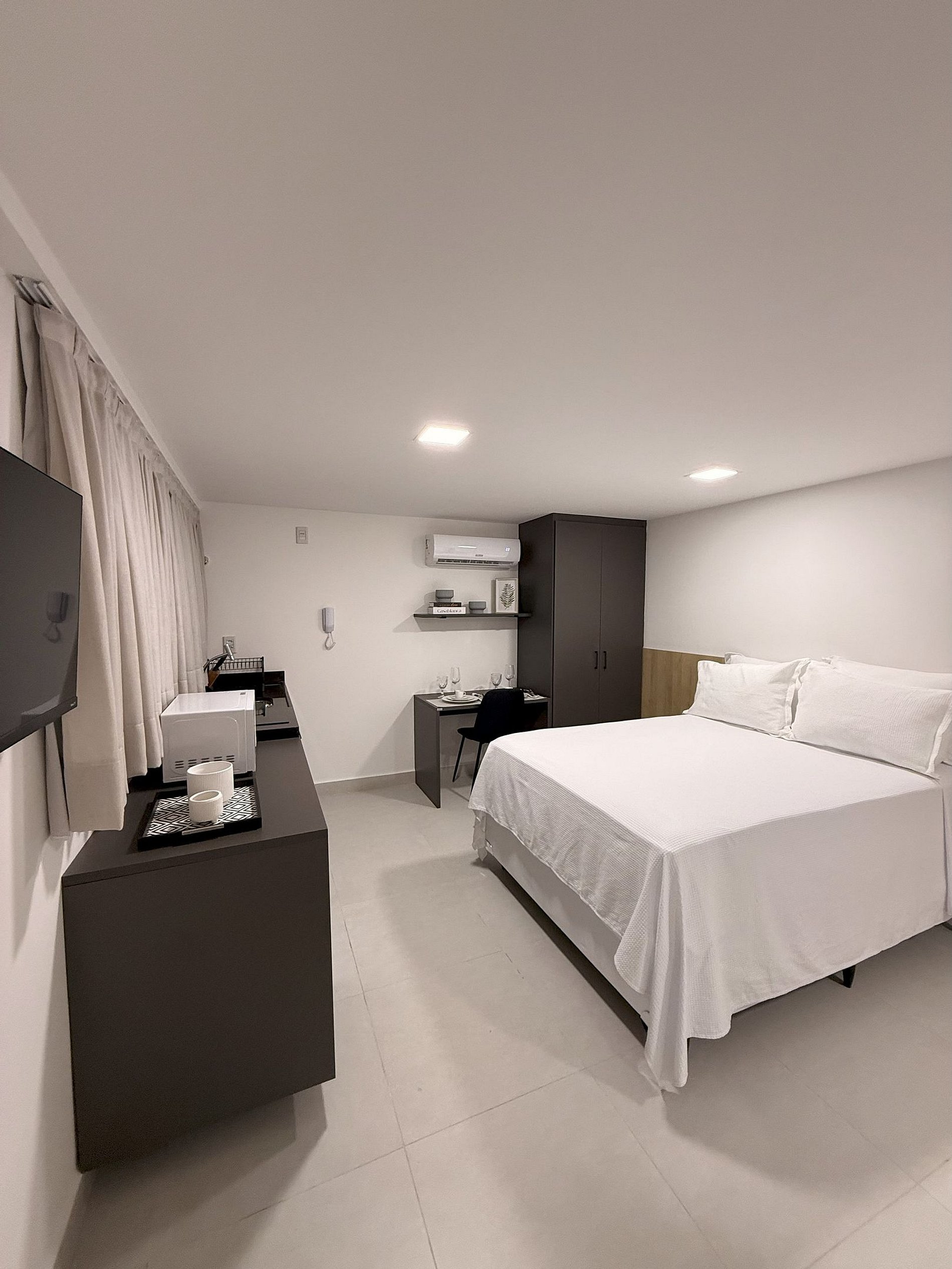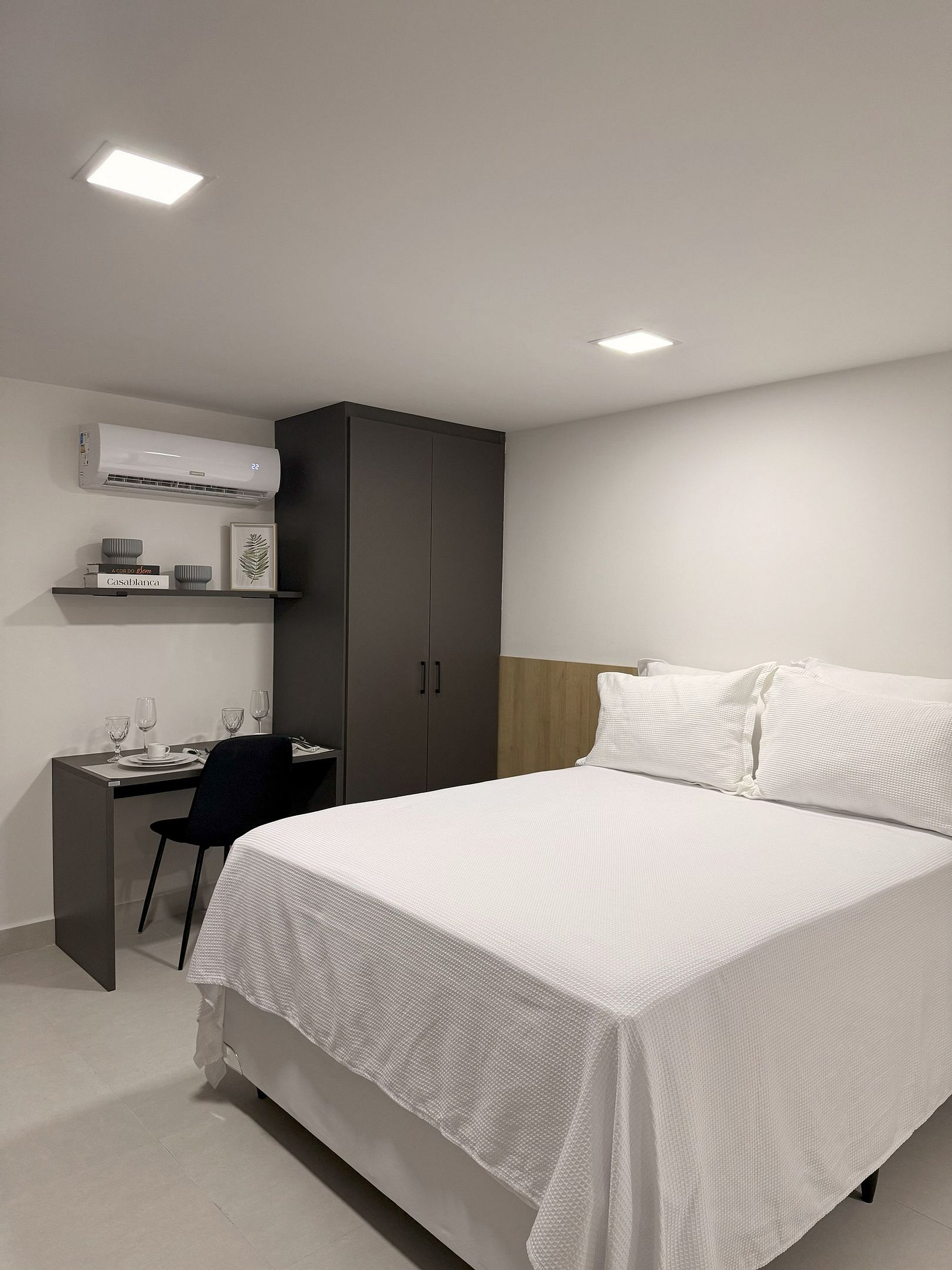 O estudio dispoe de cozinha compacta com cooktop, microondas, liquidificador, cafeteira, geladeira, sanduicheira, copos talheres, toalhas, roupas de cama tudo para voce ter sua estadia bem confortavel e tranquila, em um ambiente aconchegante, limpo higienizado