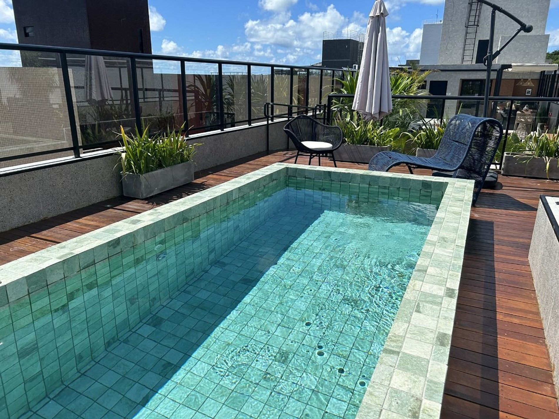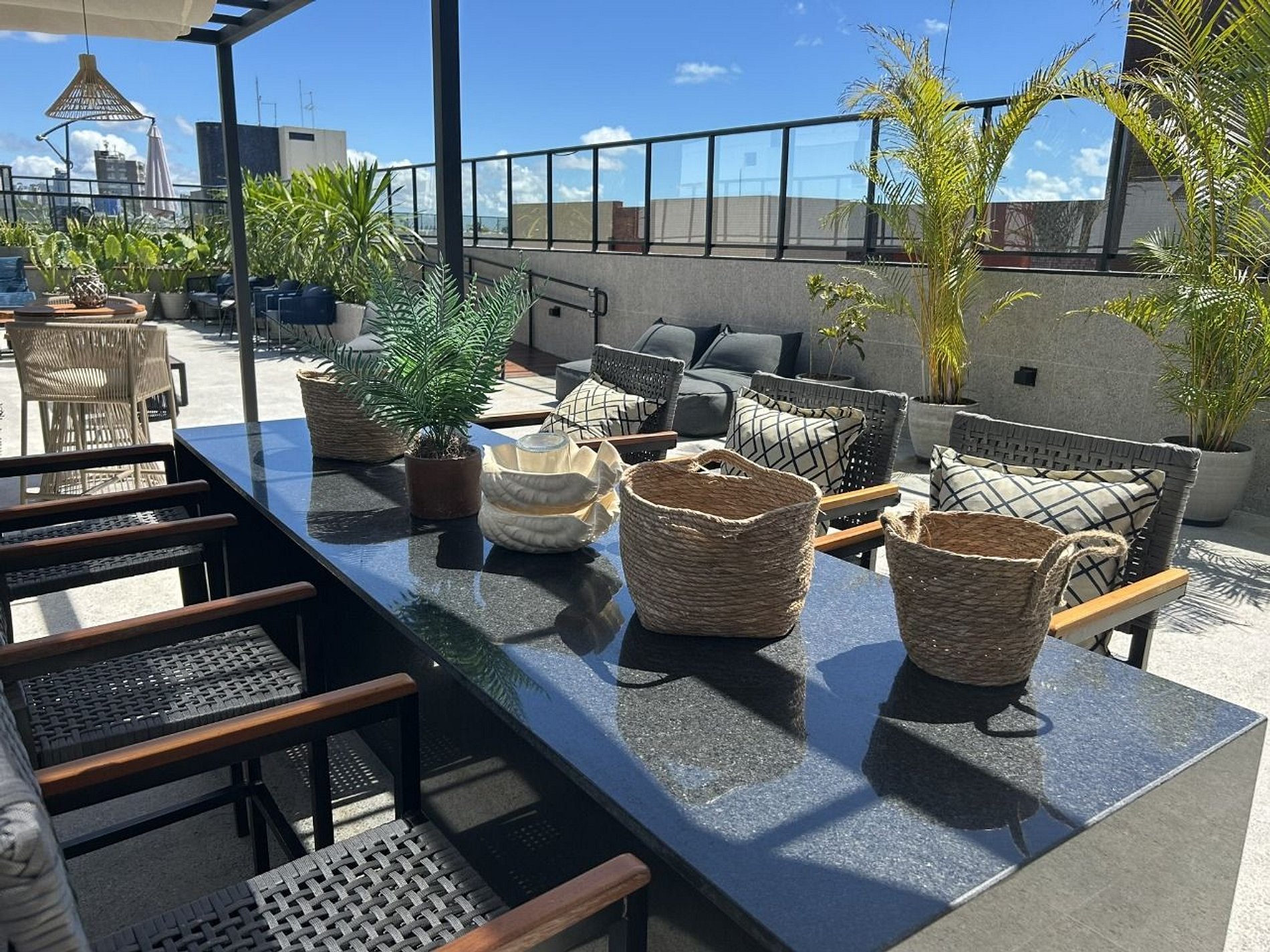 Estudio charmoso na praia de Cabo Branco em Joao Pessoa, onde dispoe de Arcondicionado, cama de casal, frigobar, cozinha compacta, roupa de cama, toalhas, papel higienico, televisao smart, wifi, louca, panelas, cafetiera, ferro de passar, secador de cabelo, liquidificador, tacas de vinho, edf conta de piscina na cobertura, patio terraco lounge, area gourmet, brinquedoteca, academia, recepcao